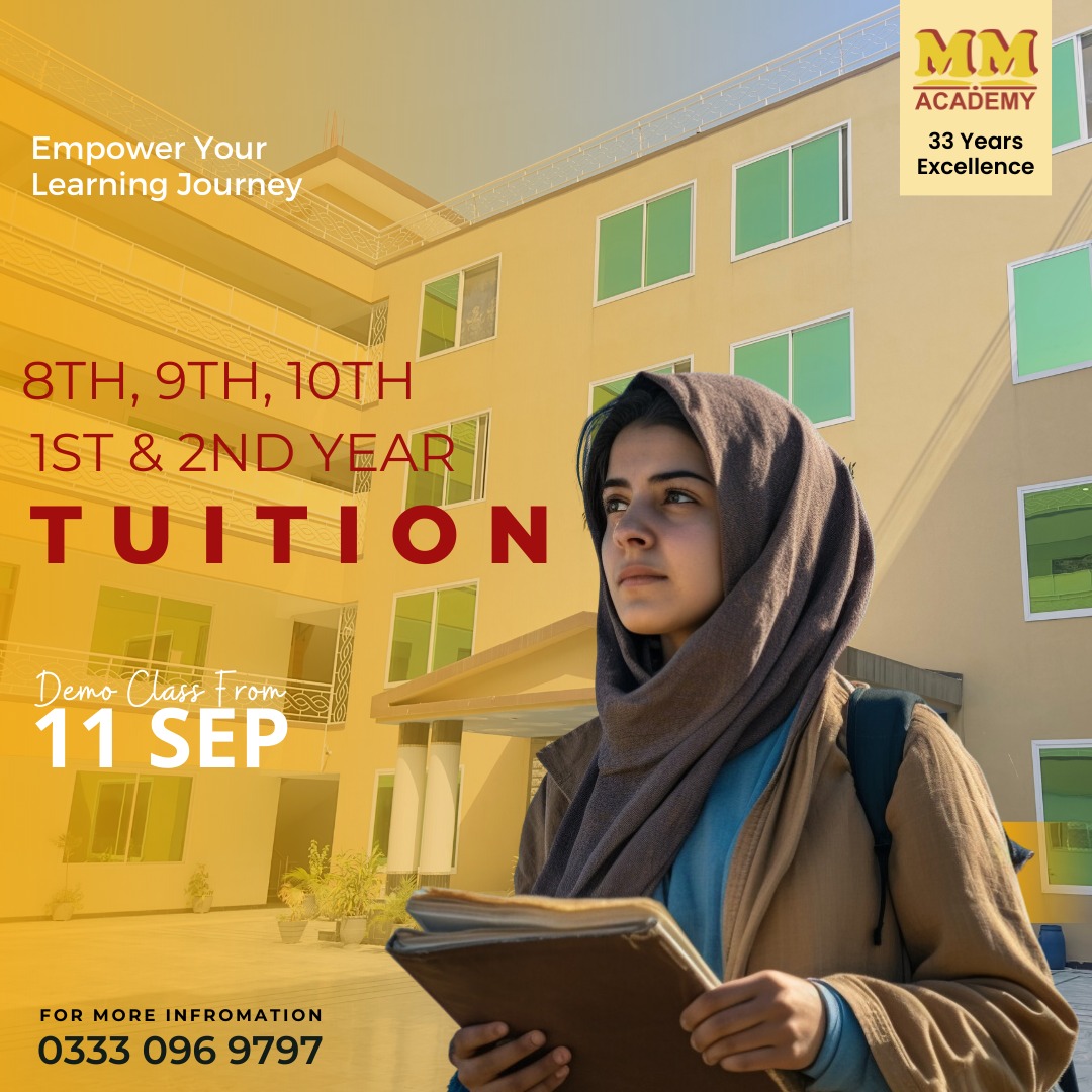 Welcome to MM Academy Peshawar, one of the oldest and the most prestigious education platforms in Khyber Pakhtunkhwa. We offer tuitions to the students of all classes, from primary to intermediate level. We also provide coaching for various competitive exams, such as ISSB, CSS, PMS, ETEA, and NMDCAT.